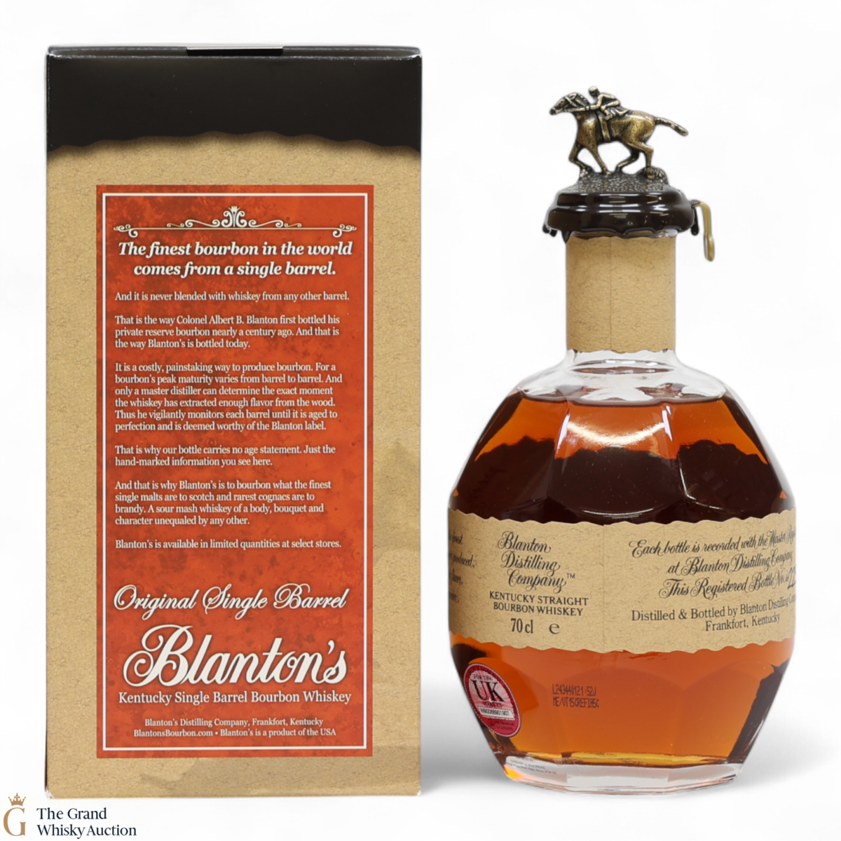PLEASE NOTE: The wax seal on Blanton's bottles are prone to cracking in transit due to their design. Therefore, as stated in our T&C’s, we do not and will not accept liability should the seal be breached, broken, split or leak in transit. Additionally, please know due to the design of the internal cardboard packaging that surrounds the top of the bottles, it too may be torn. By bidding on this lot you have understood this to be true. Insurance is for complete breakage or loss in transit only.
