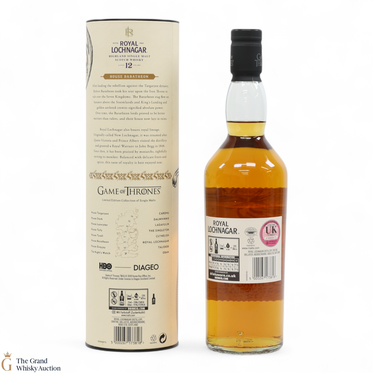 This is a limited-edition 12 year old single malt from Royal Lochnagar and it is part of Diagio's 2018 collaboration with HBO. Each single malt in the series relates to the land of houses of the Game of Thrones television series. The Royal Lochnagar bottle is decorated with a rampant black Stag, the sigil of House Baratheon that once flew on banners above the Stormlands and King’s Landing signifying absolute power.