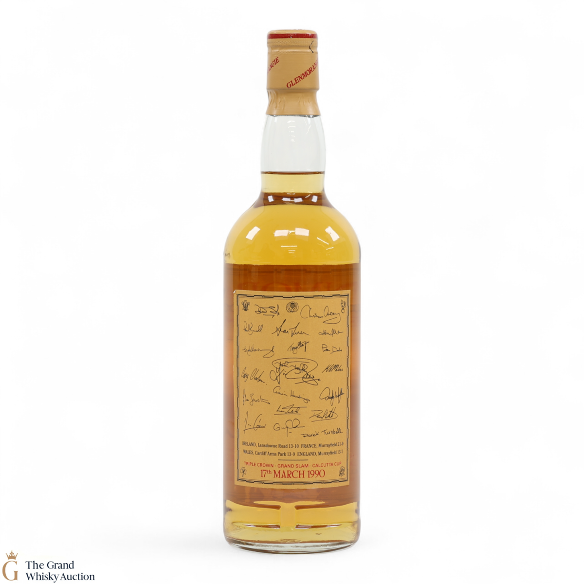 This bottle of Glenmorangie 10-Year-Old was released in celebration of the Scottish Rugby Team's Grand Slam win in 1990 - the victory took place on 17th March 1990 and this is detailed on the neck label.