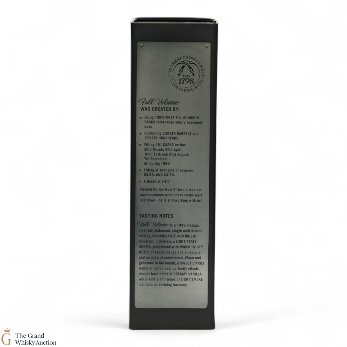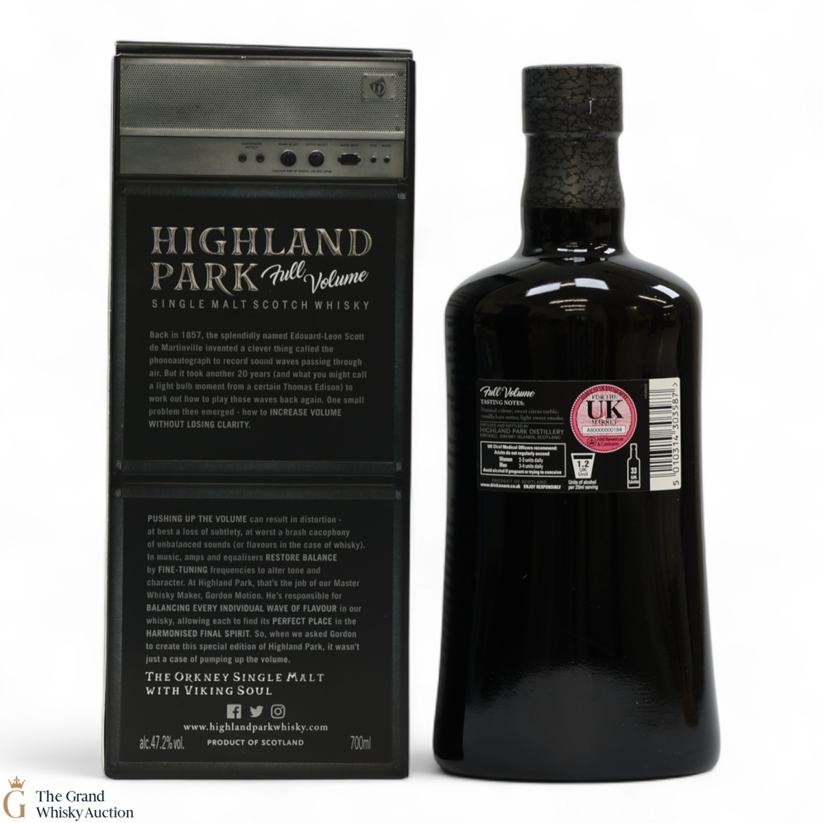 Full Volume by Highland Park was distilled in 1999 and bottled in 2017 from 481 casks. The single malt was matured exclusively in first-fill bourbon casks and was bottled at 47.2% ABV and comes presented in a themed presentation box resembling speaker.
