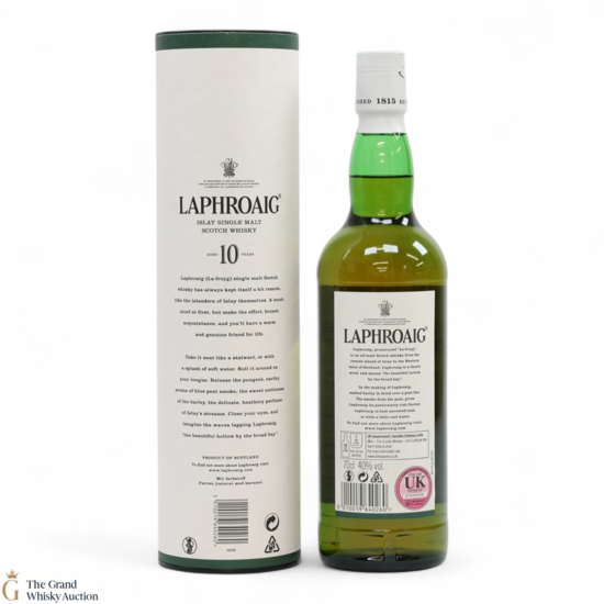 A 70cl of the medicinal 10 year old from Islay's bestselling distillery, Laphroaig. In making Laphroaig, malted barley is dried over a peat fire. The smoke from this peat, found only on Islay, gives Laphroaig its particularly rich flavour.