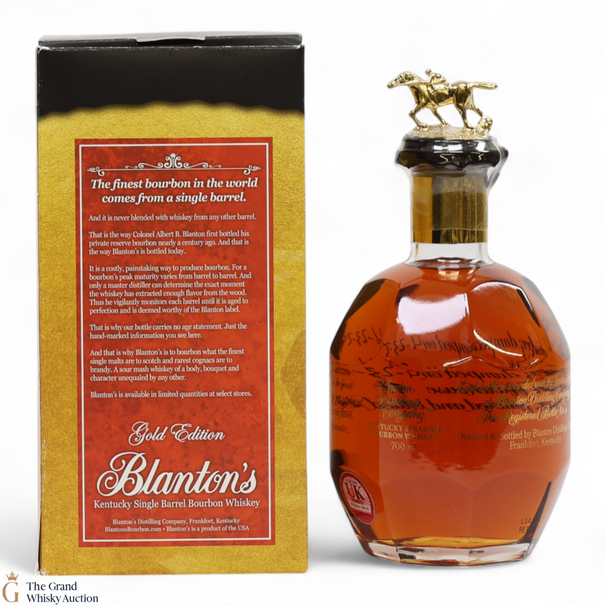 PLEASE NOTE: The wax seal on Blanton's bottles are prone to cracking in transit due to their design. Therefore, as stated in our T&C’s, we do not and will not accept liability should the seal be breached, broken, split or leak in transit. Additionally, please know due to the design of the internal cardboard packaging that surrounds the top of the bottles, it too may be torn. By bidding on this lot you have understood this to be true. Insurance is for complete breakage or loss in transit only.