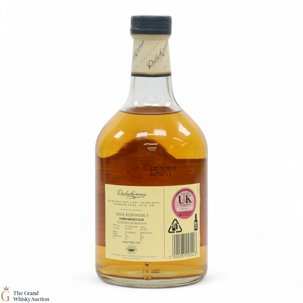 Due to the various ages of bottles and their seals, the condition of liquid is at the buyer's discretion and no claim can be lodged against failure/leakage in transit. Loss and breakage cover is available at 3% of the hammer price as standard. If the lot is not insured, no claim can be lodged against the courier or The Grand Whisky Auction for breakage or loss in transit.