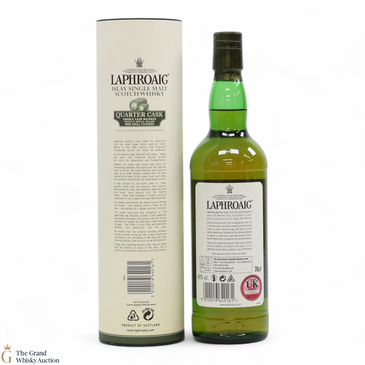 A younger, lively Laphroaig that has had the maturation process speeded up by ageing in quarter casks. As the size of the cask is smaller the maturation doesn't need to be as long. This process has created a soft sweetness and a velvety feel when first tasted, and then the intense peatiness so unique to Laphroaig comes bursting through.