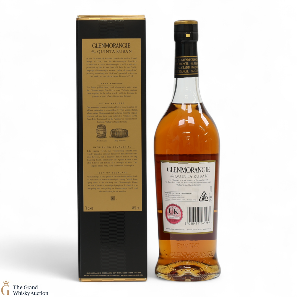 Glenmorangie Quinta Ruban is matured in bourbon casks before finishing in the finest Ruby Port casks from the "Quintas" or wine estates of Portugal. Ruban is Gaelic for Ruby.