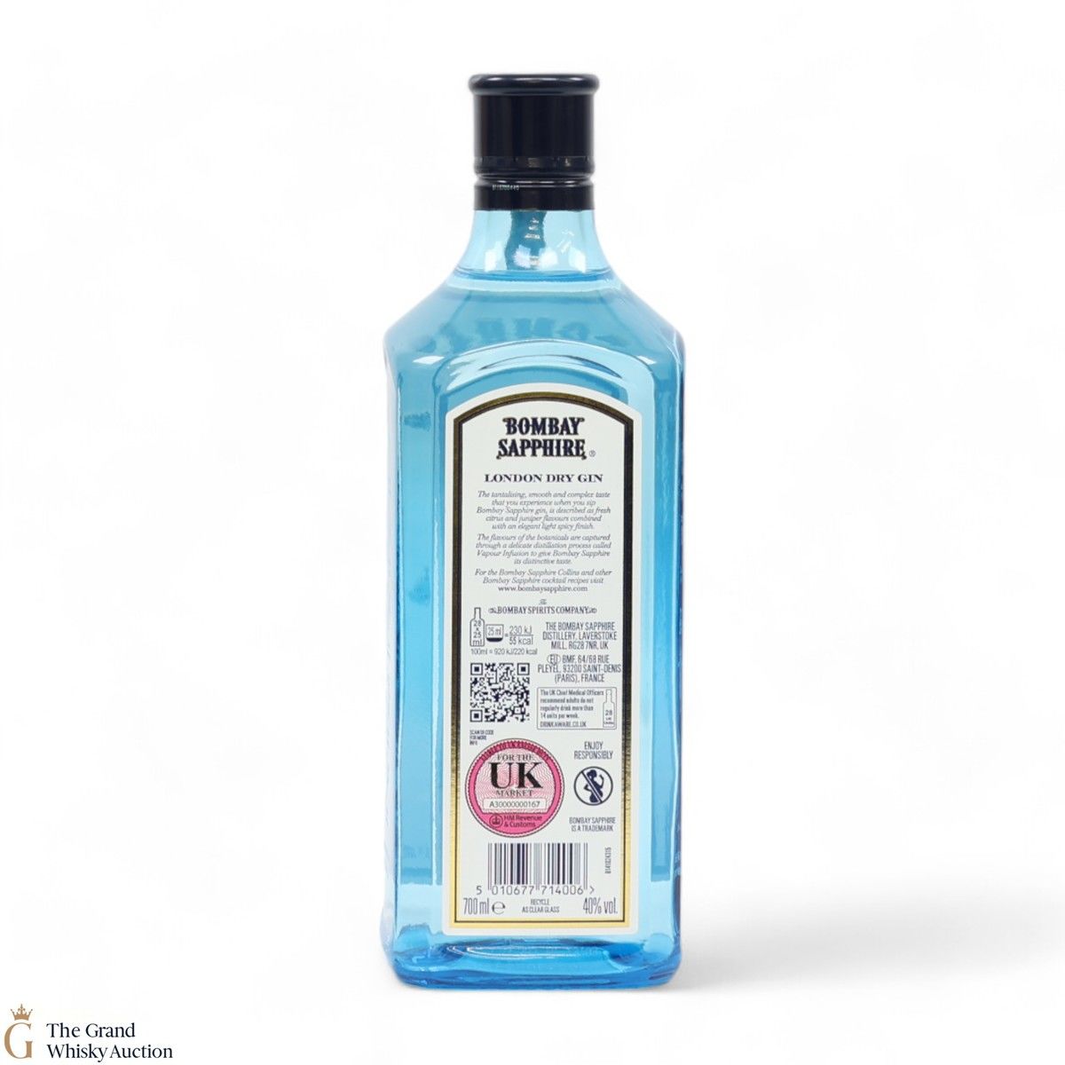 Bombay Sapphire London Dry Gin in its distinctive blue bottle. Every drop contains 10 hand-selected botanicals from exotic locations around the world.