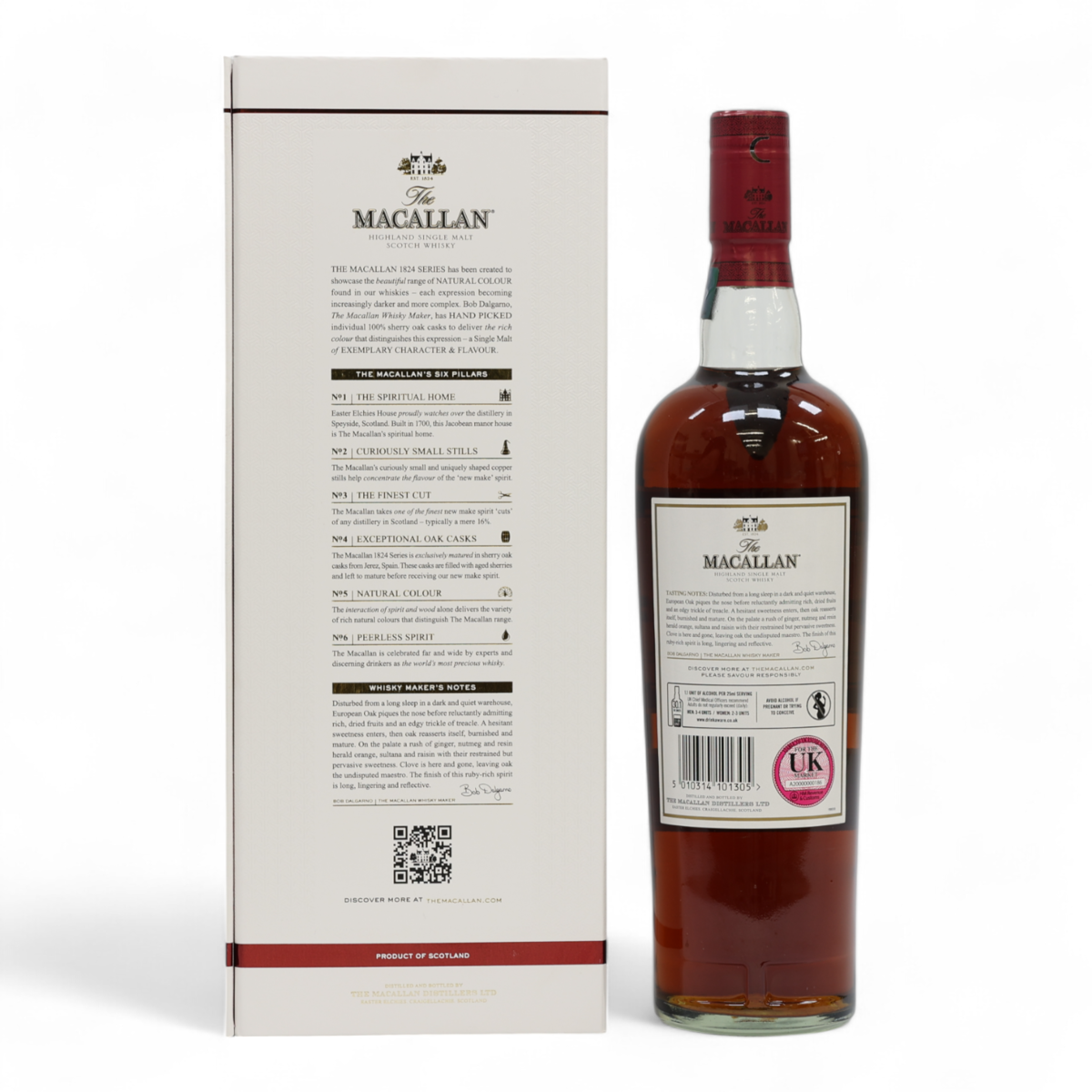 The Macallan 1824 Series celebrates natural colour. The most distinctive and defining characteristic of Macallan is the sherry-seasoned oak casks that are used to mature the whisky. This series shows commitment to 100% natural colour, drawn from wood. The colour of each expression becomes deeper as the range progresses.