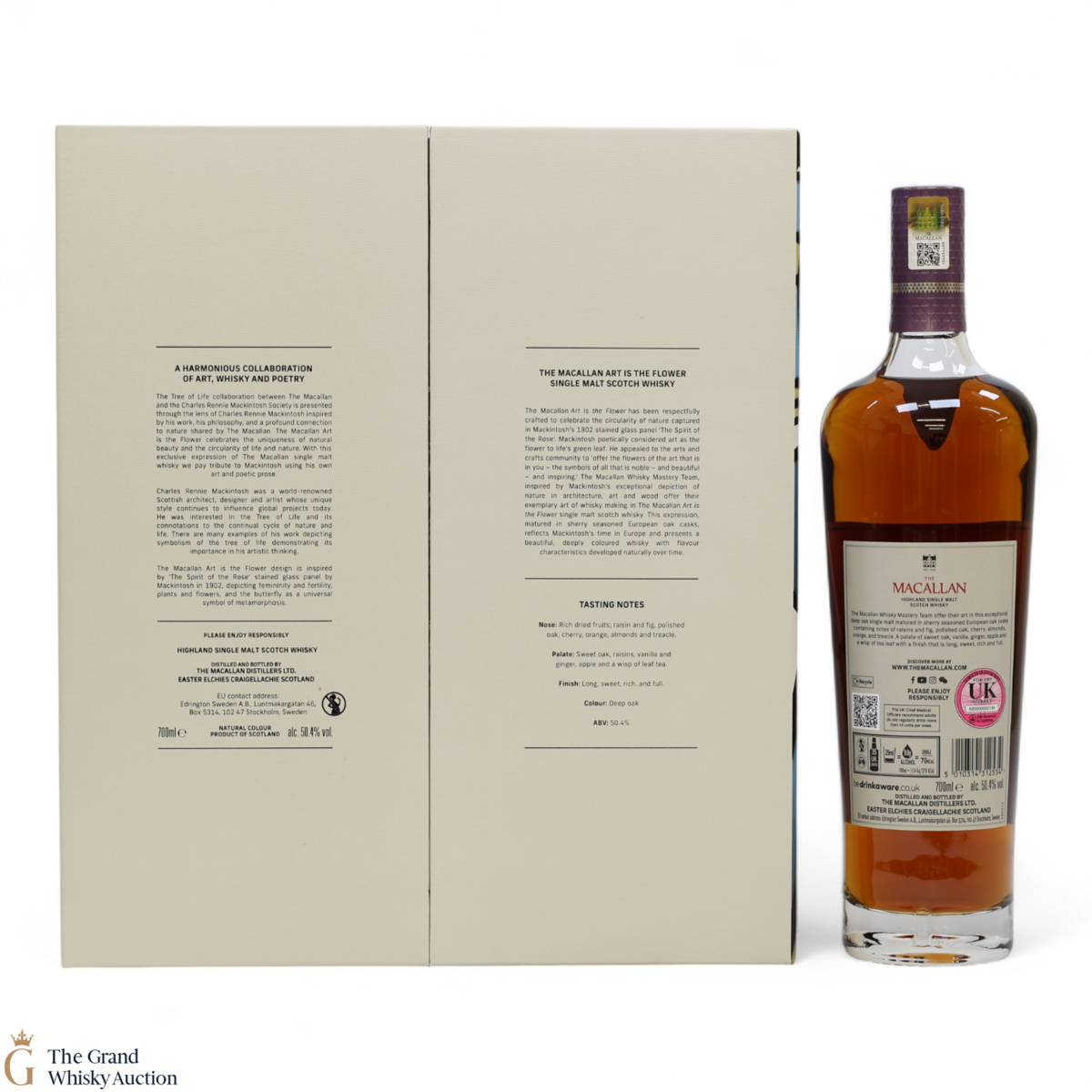 Inspired by Mackintosh's exceptional depiction of nature in architecture, art and design, The Macallan Whisky Mastery Team's exemplary art of whisky making is expressed in The Macallan Art is the Flower single malt scotch whisky.