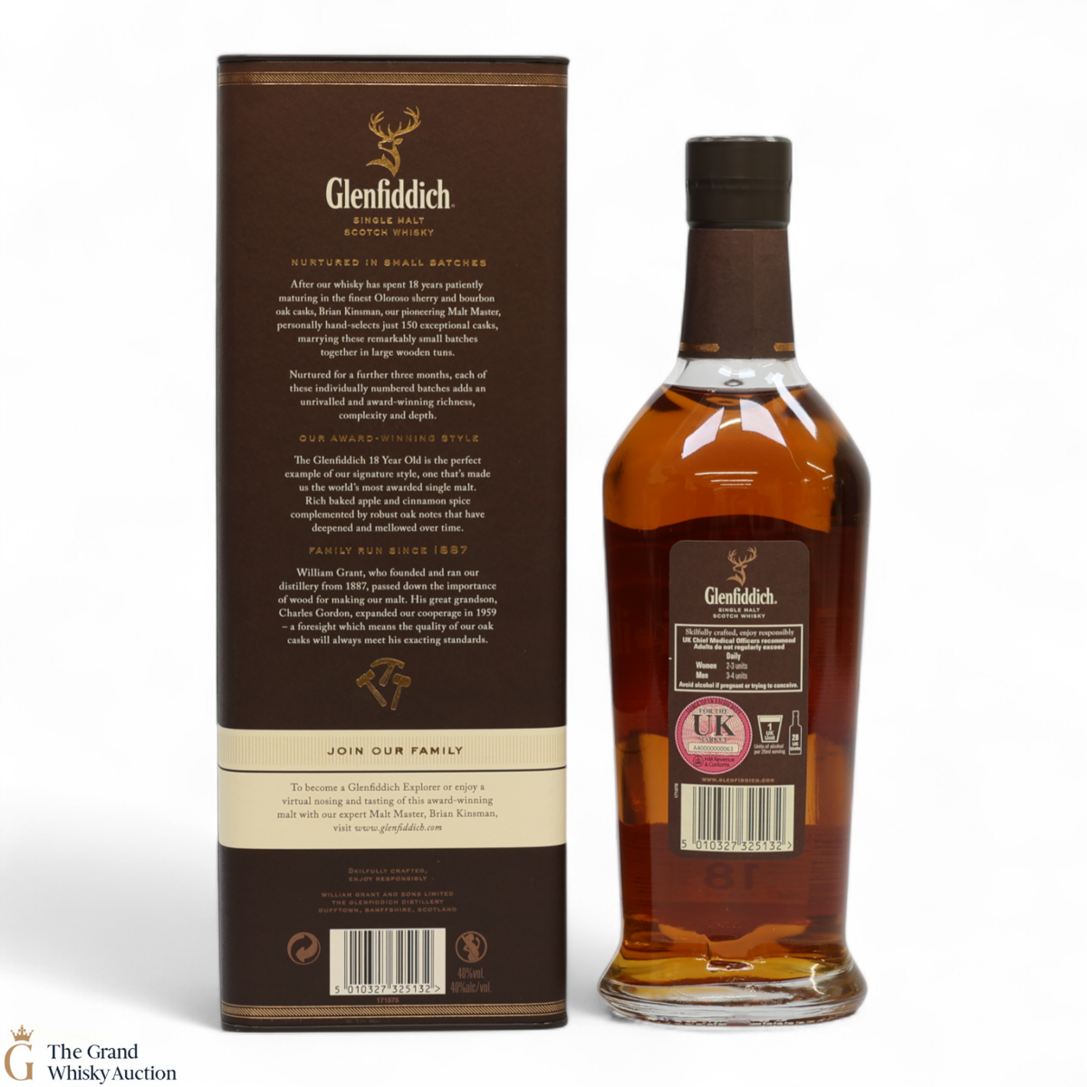 Matured in small batches the Glenfiddich 18 is arguably the most complex in the core range. The single malt has been matured in oloroso sherry and bourbon casks. It is very fragrant with tropical fruit and sherry cask influences, rich baked apple and cinnamon spice compliments by robust oak notes.