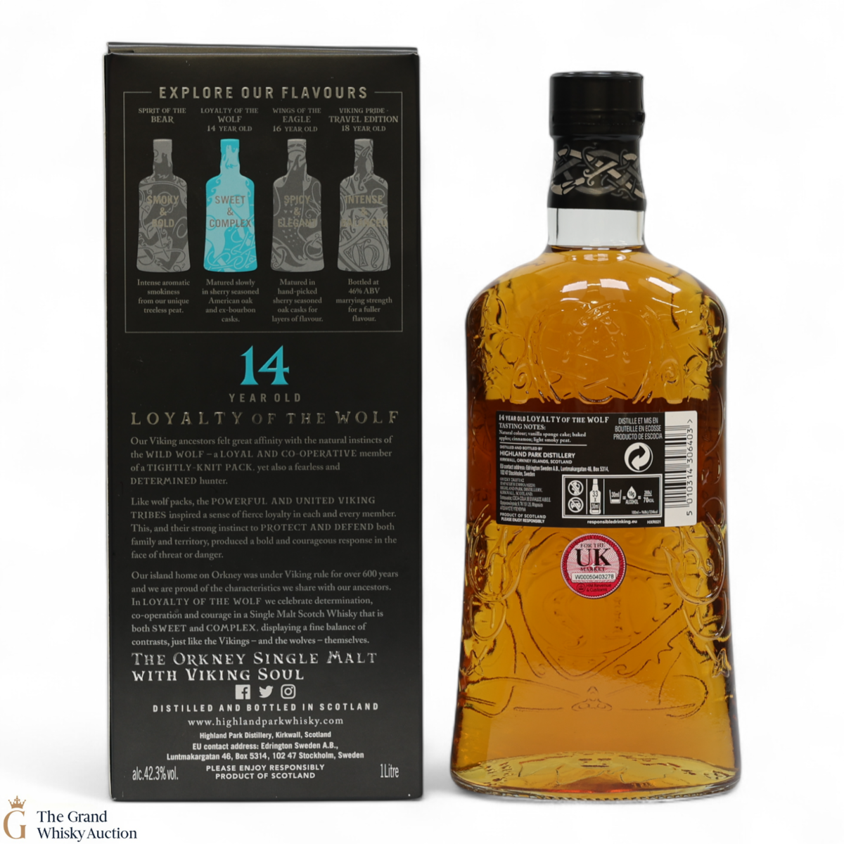 The 'Loyalty of the Wolf' by Highland Park is a 14-year-old single malt. This is a 1L bottle.