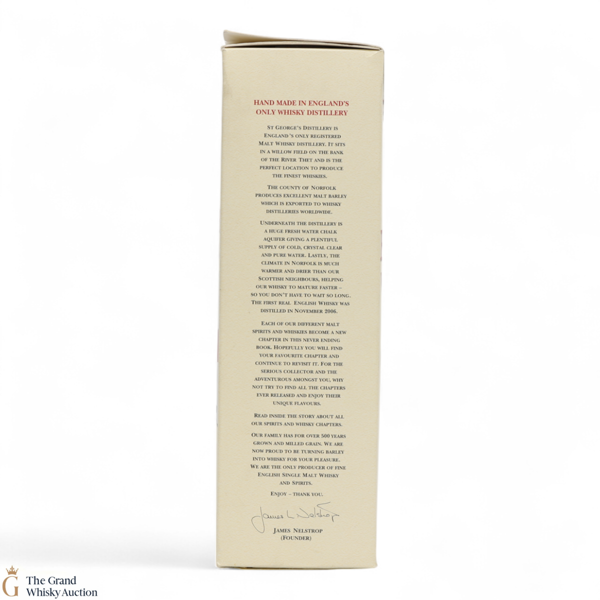 A peated malt spirit from England's only distillery, the Norfolk-based St George's. Matured for a minimum of 3 years and bottled at natural colour from casks 103, 106, 109 & 128.