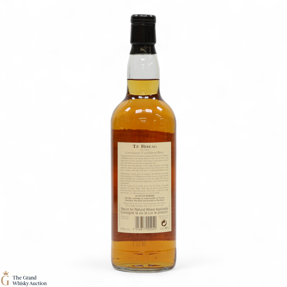 Due to the various ages of bottles and their seals, the condition of liquid is at the buyer's discretion and no claim can be lodged against failure/leakage in transit. Loss and breakage cover is available at 3% of the hammer price as standard. If the lot is not insured, no claim can be lodged against the courier or The Grand Whisky Auction for breakage or loss in transit.