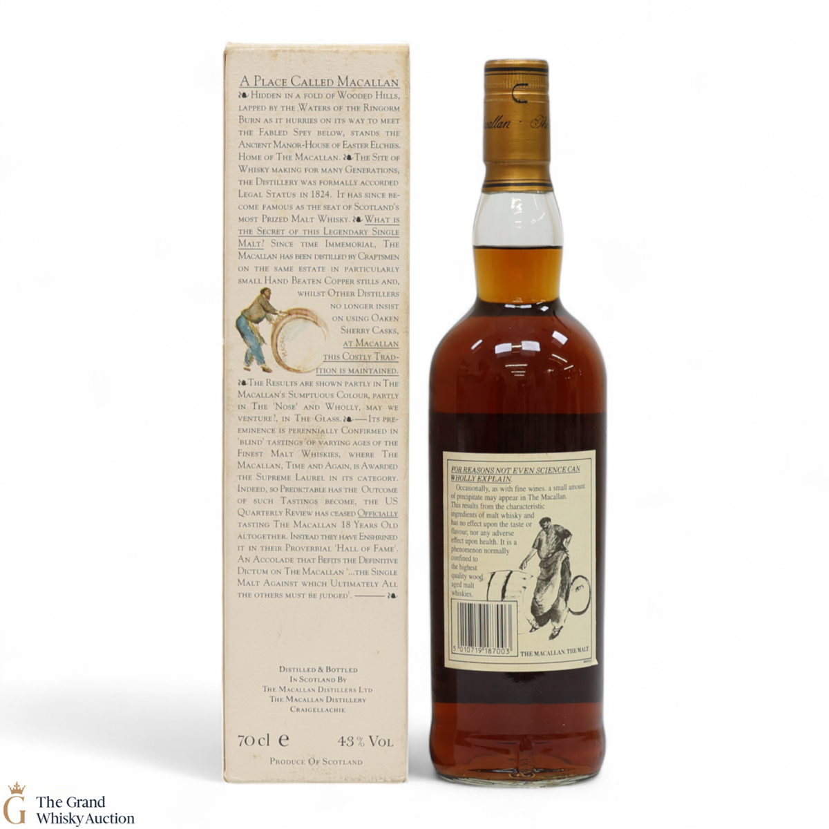 Macallan 18 year old, distilled in 1980 was matured in Sherry wood casks at the heart of Speyside - Easter Elchies House. It was later bottled in 1999. This is a rare and collectable bottle, highly sought-after by whisky enthusiasts.