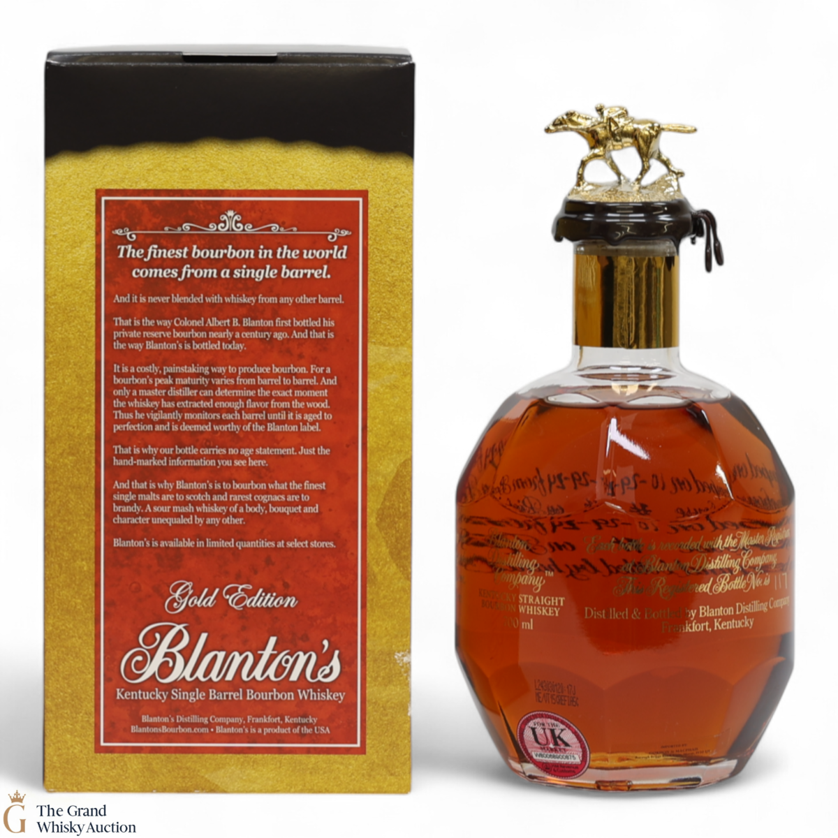 PLEASE NOTE: The wax seal on Blanton's bottles are prone to cracking in transit due to their design. Therefore, as stated in our T&C’s, we do not and will not accept liability should the seal be breached, broken, split or leak in transit. Additionally, please know due to the design of the internal cardboard packaging that surrounds the top of the bottles, it too may be torn. By bidding on this lot you have understood this to be true. Insurance is for complete breakage or loss in transit only.