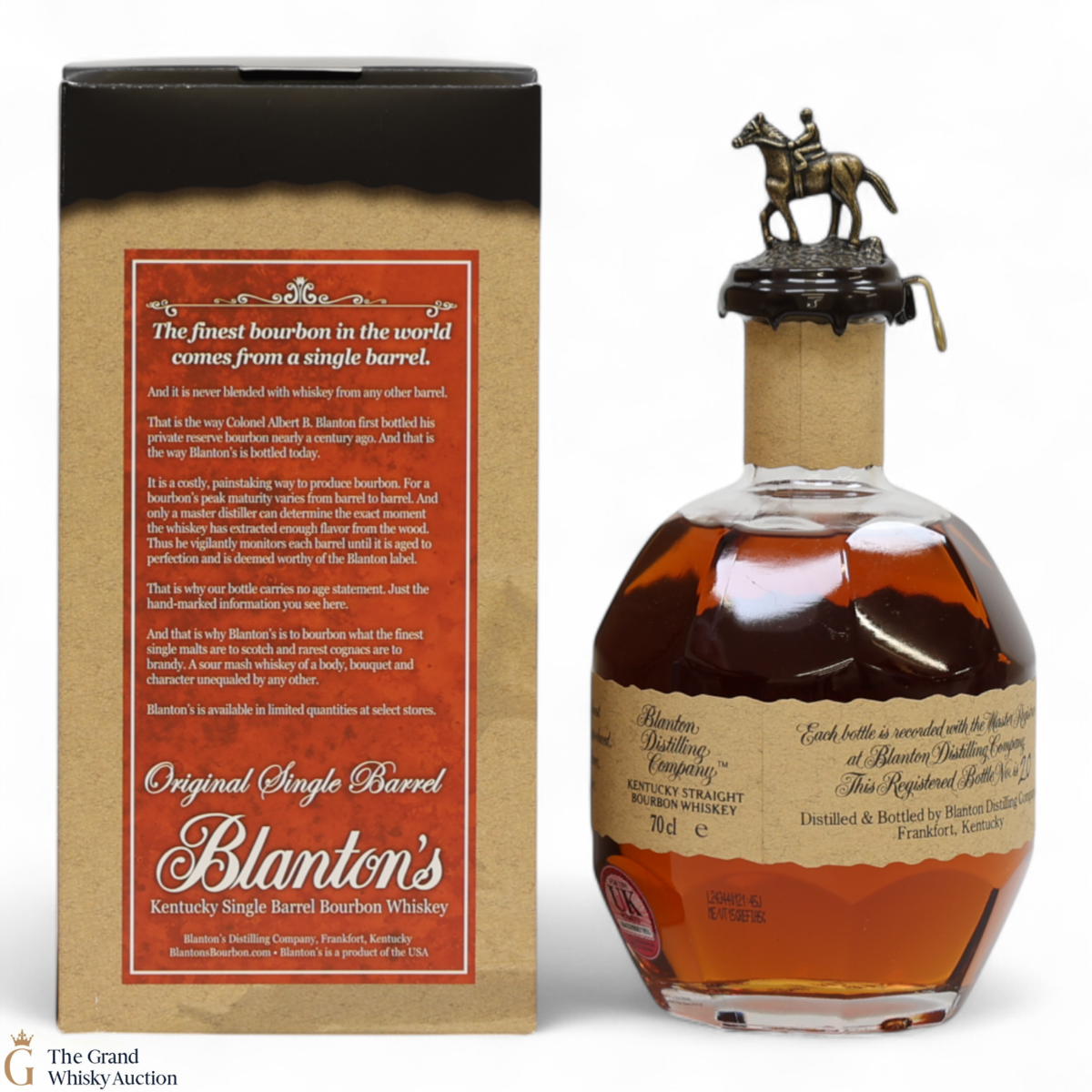 PLEASE NOTE: The wax seal on Blanton's bottles are prone to cracking in transit due to their design. Therefore, as stated in our T&C’s, we do not and will not accept liability should the seal be breached, broken, split or leak in transit. Additionally, please know due to the design of the internal cardboard packaging that surrounds the top of the bottles, it too may be torn. By bidding on this lot you have understood this to be true. Insurance is for complete breakage or loss in transit only.