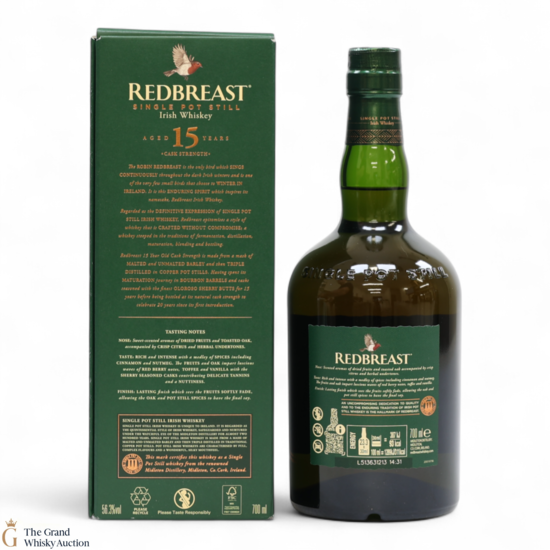 Redbreast is a single pot still whiskey distilled at New Midleton in Ireland using a combination of malted and unmalted barley. Triple distilled in copper pot stills. Redbreast 15 Year Old has won awards, including a Gold Medal at the International Spirits Challenge 2010.