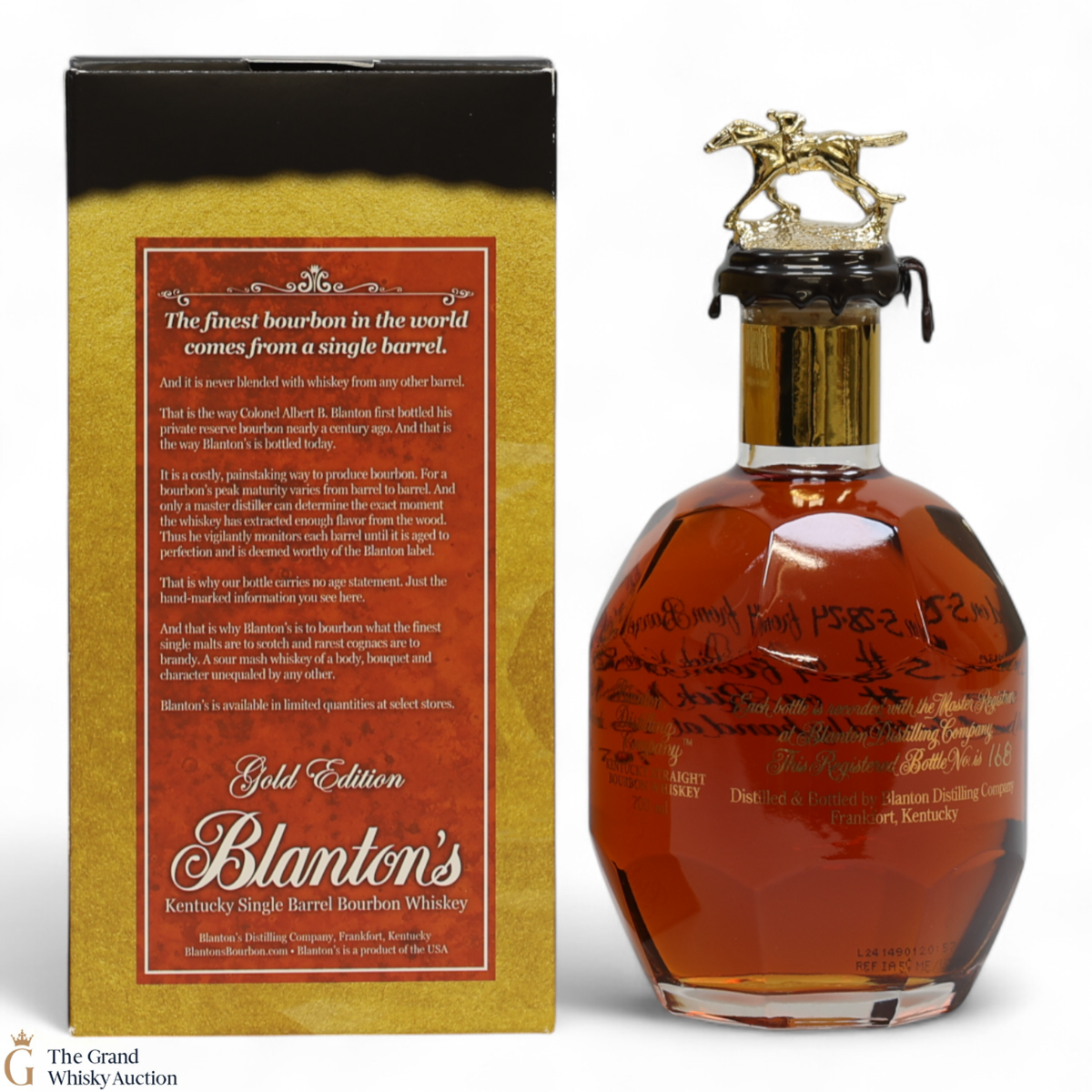 PLEASE NOTE: The wax seal on Blanton's bottles are prone to cracking in transit due to their design. Therefore, as stated in our T&C’s, we do not and will not accept liability should the seal be breached, broken, split or leak in transit. Additionally, please know due to the design of the internal cardboard packaging that surrounds the top of the bottles, it too may be torn. By bidding on this lot you have understood this to be true. Insurance is for complete breakage or loss in transit only.