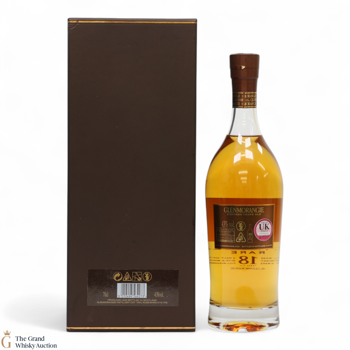 This bottle is an 18-year-old Extremely Rare, Highland single malt produced by Glenmorangie. It has been perfected by the sixteen men of Tain who have specially aged this bottle for 18 years in superior oak casks.
