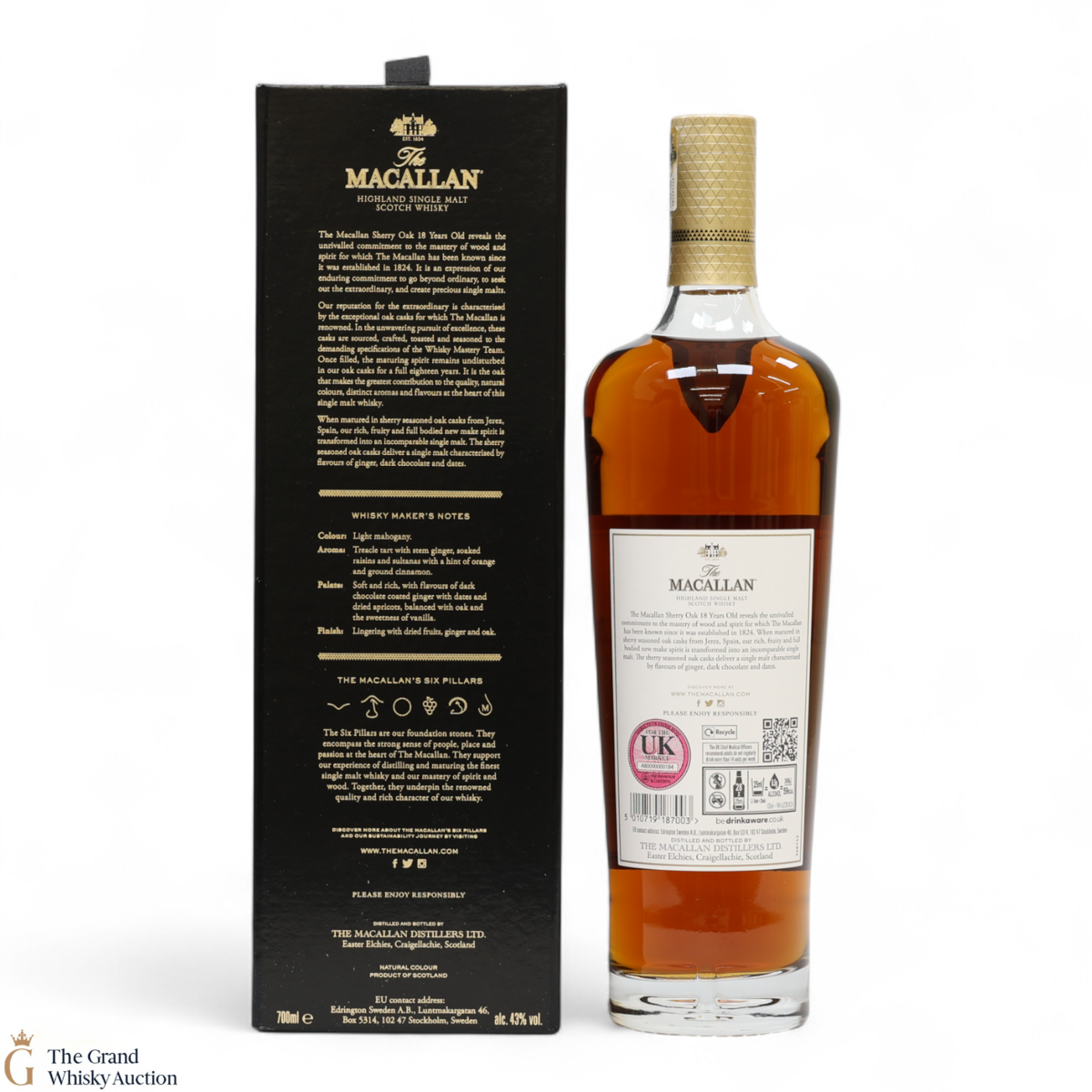 This annual release of The Macallan's popular 18-year-old Sherry Oak is matured exclusively in sherry-seasoned casks, built from both Spanish and American oak, providing a beautifully dark flavour with rich aromas.