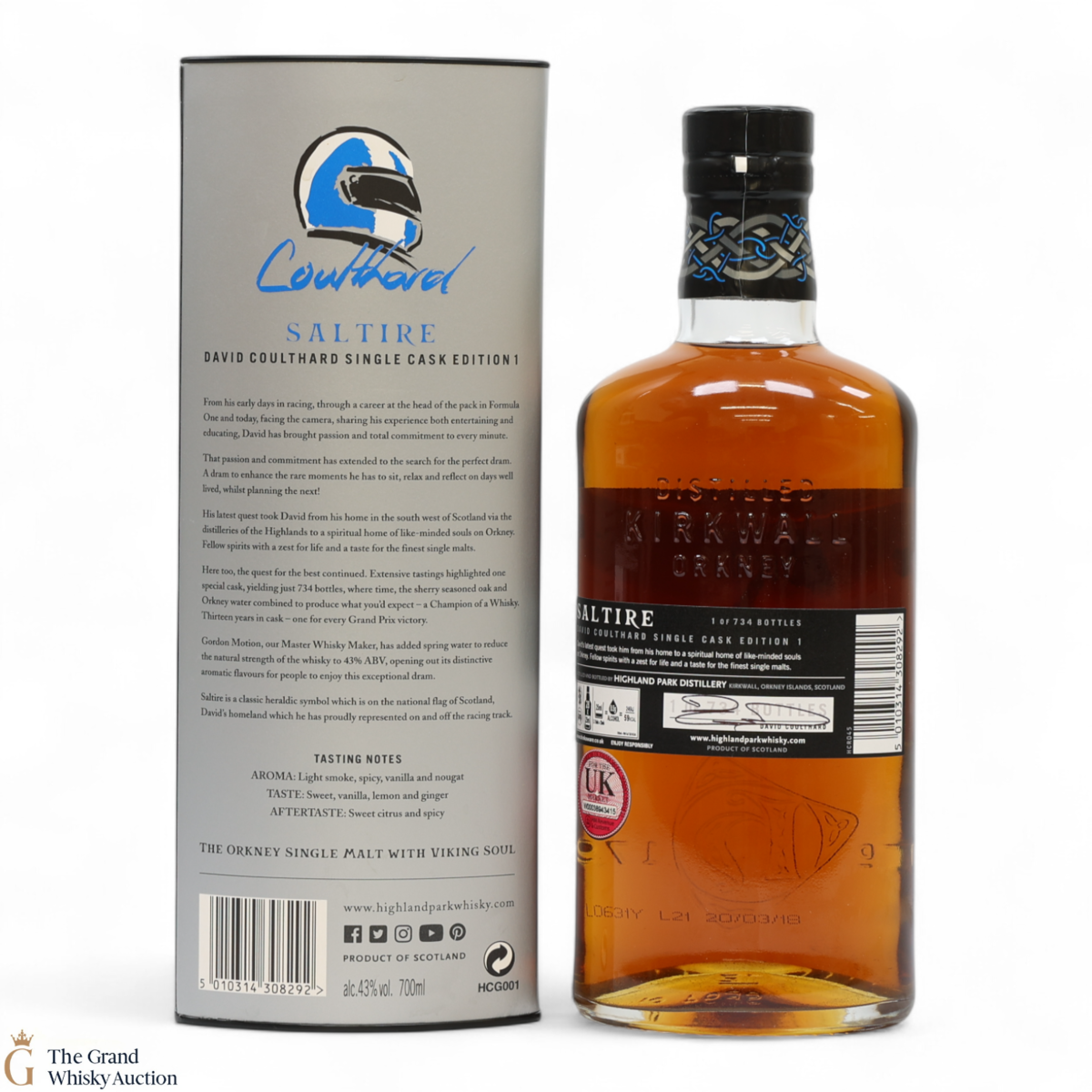 The single cask bottling, Highland Park Saltire Edition is a 13 year old whisky inspired by Coulthard’s 13 Grand Prix victories. This is one of just 734 bottles.