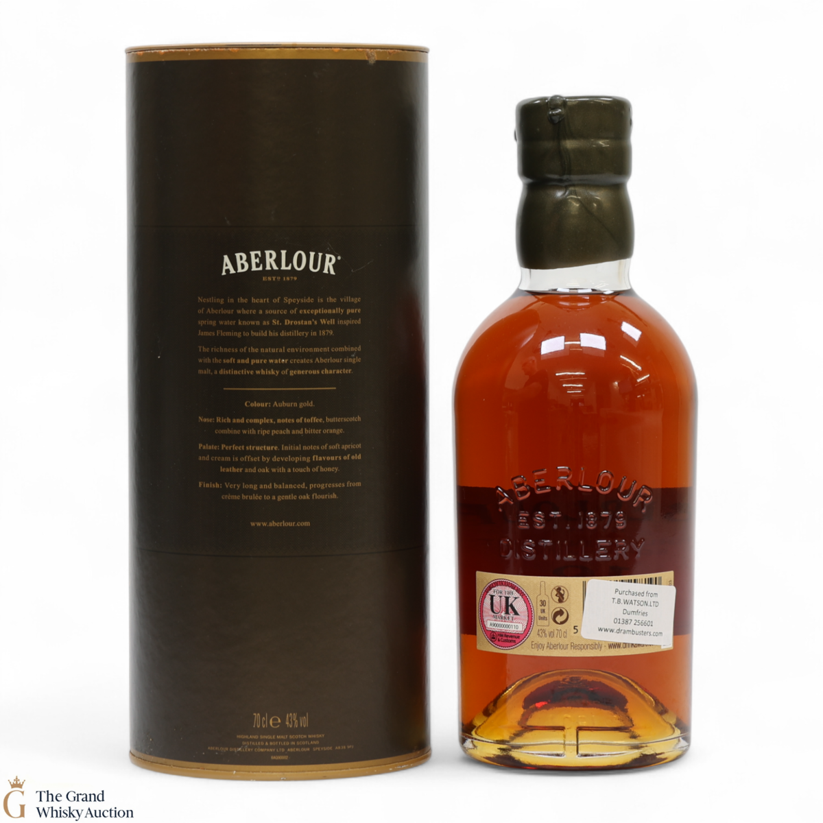 Due to the various ages of bottles and their seals, the condition of liquid is at the buyer's discretion and no claim can be lodged against failure/leakage in transit. Loss and breakage cover is available at 3% of the hammer price as standard. If the lot is not insured, no claim can be lodged against the courier or The Grand Whisky Auction for breakage or loss in transit.