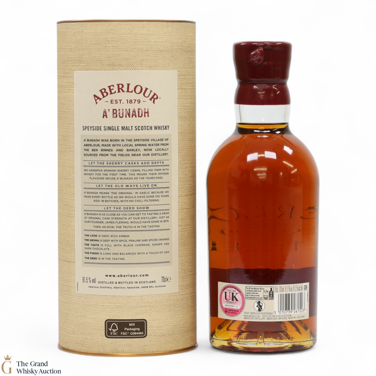Distilled at the Aberlour Distillery, this single malt was matured in Spanish oloroso sherry butt barrels until being bottled at the cask strength of 61.5% ABV. This is batch 68 of the A'Bunadh.