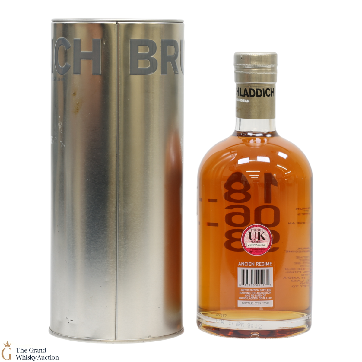 Released for Fèis Ìle 2011, Bruichladdich 1998 Ancien Regime was distilled in 1998 under the previous ownership. It was a limited release with only 2,500 bottles and was matured in bourbon casks. The release was one of two, to mark the acquisition and rebirth of Bruichladdich distillery.