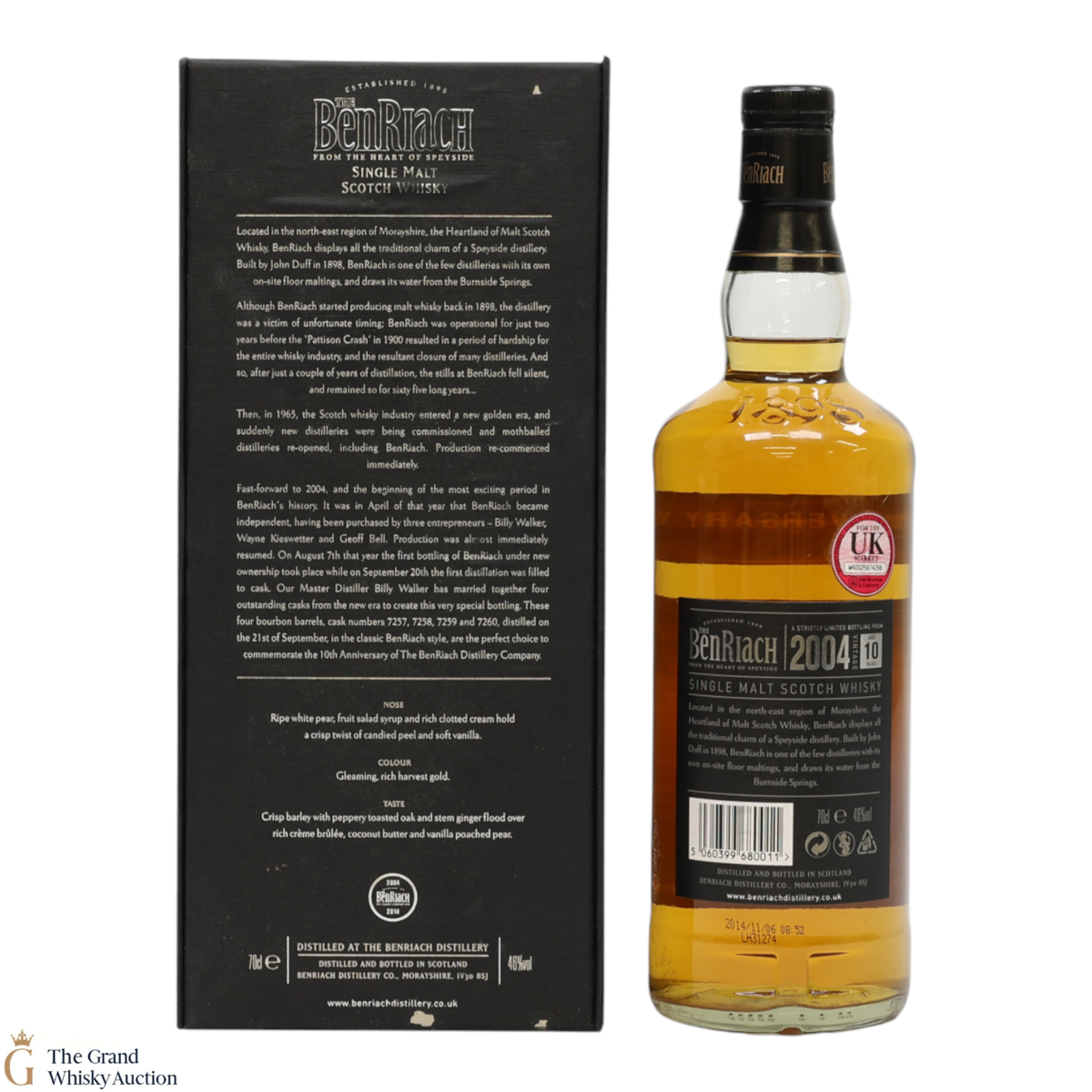 A 10-year-old Benriach to commemorate the 10th anniversary of the reopening of the distillery by Billy Walker. Created exclusively from Benriach distilled during the very first week of production under independent ownership from four ex-bourbon barrels filled on 21 September 2004.