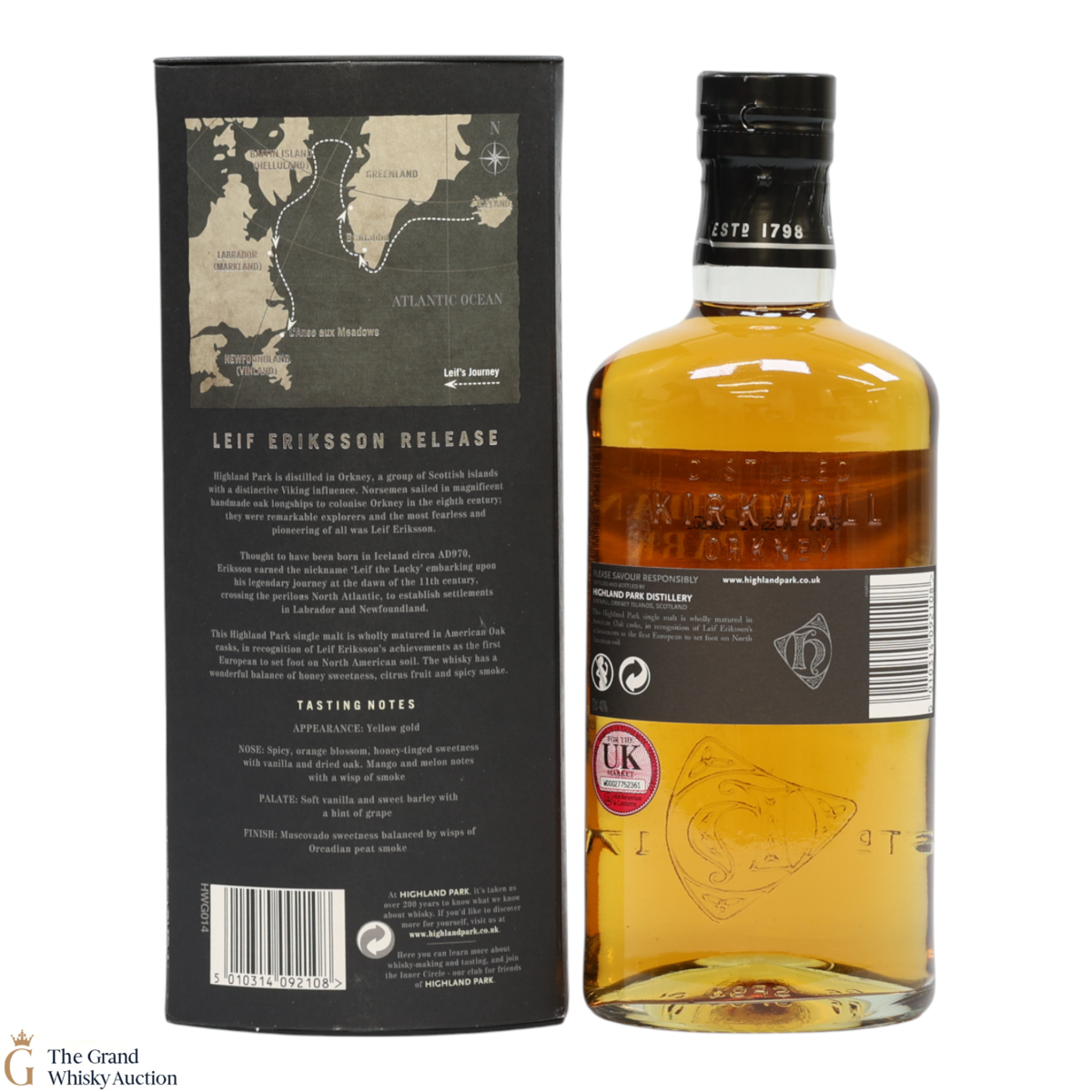 Launched in March 2010, for the travel retail market, Highland Park Leif Eriksson Limited Edition was released to celebrate the first European to reach America over a thousand years ago. The single malt was matured in American oak casks, both ex-bourbon and ex-sherry in recognition of Leif Eriksson, a pioneering Viking explorer, as the first European man to set foot on American soil.