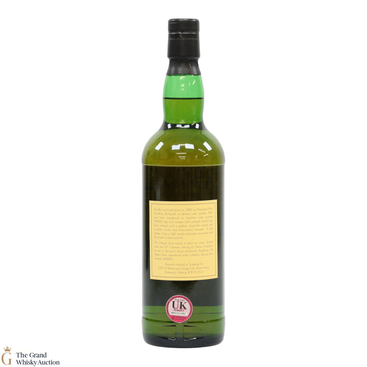 This 19 year old single malt is from Orkney's Highland Park Distillery, distilled back in 1990. It was matured in Oloroso sherry cask #7616 and later transferred to bourbon cask #900001. It was bottled nearly two decades later by S. & J. D. Robertson, at natural cask strength, as part of The Dragon Range. The Dragon Bottlings are legendary and highly sought after by many.