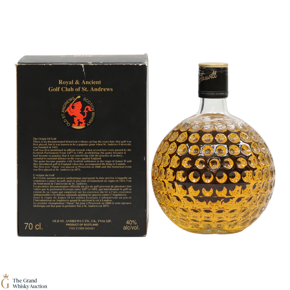 Old St Andrews Clubhouse, a blended whisky in the bottle form of a golf ball-shaped decanter.