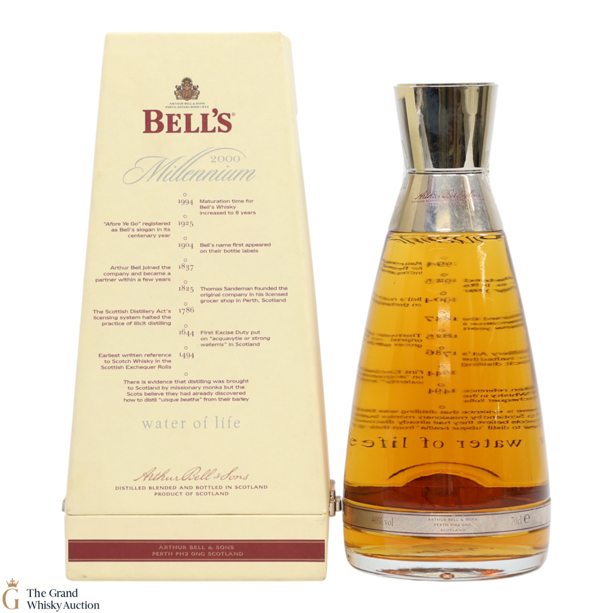 A special Millennium decanter of 8-year-old blended whisky from Bell's, bottled for the Millennium in 2000, consisting of single malt and grain whiskies.
