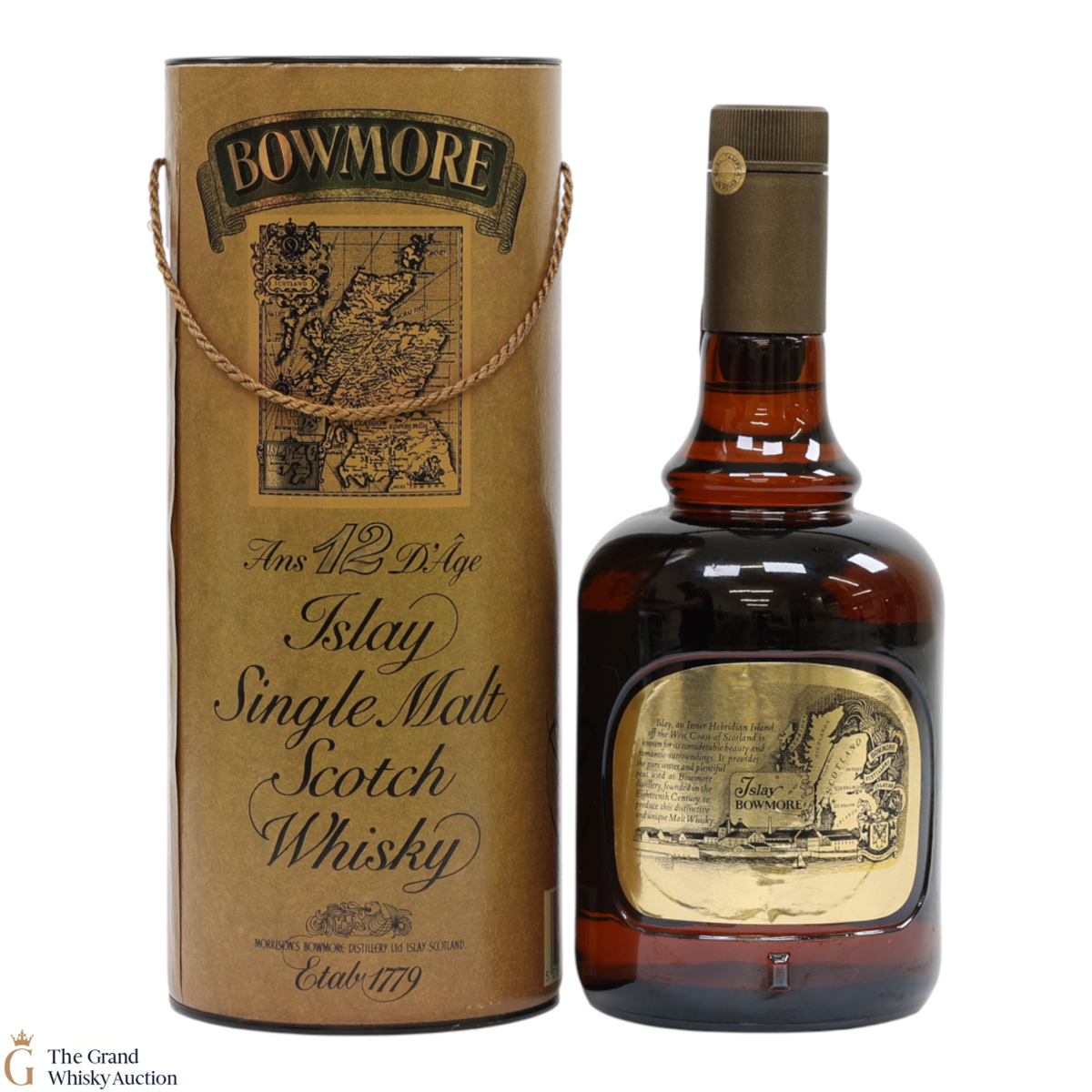 This is an iconic old dumpy style 75cl bottle of Bowmore 12-year-old Bowmore estimated to be from the 1980s. It was bottled when the distillery was Morrison's Bowmore before it was bought over by Suntory in 1989.