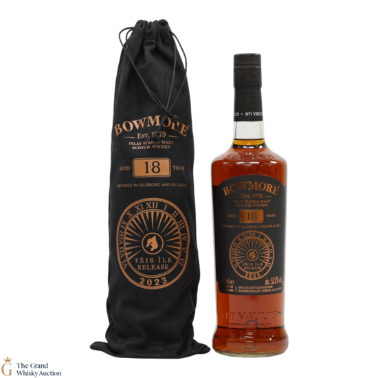 This is the Feis Ile 2023 release from Bowmore Distillery. Matured in a first-fill Oloroso Sherry and PX casks for 18 years, this single malt was bottled at 52.8% ABV. This rare annual release from Bowmore is limited to just 3500 bottles.
