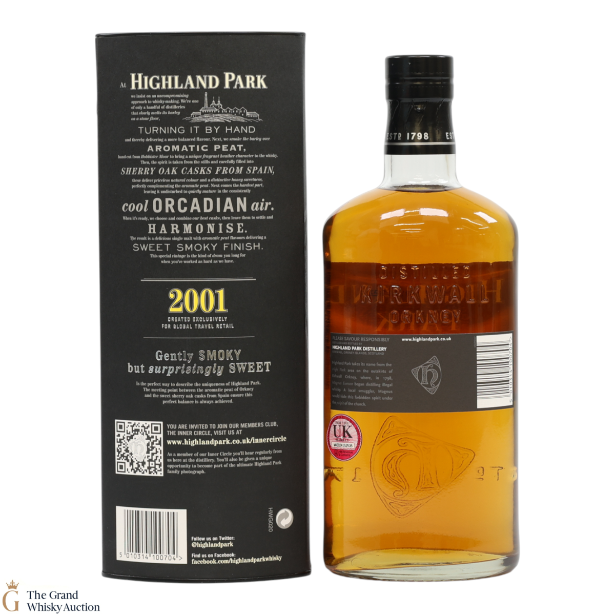 A 2001 vintage Highland Park originally released for the travel retail market, which was distilled in 2001 and bottled in 2012. Made with a high proportion of first-fill American oak casks.