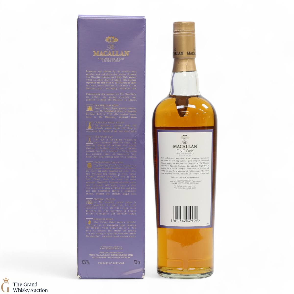 An 18-year-old single malt, part of Macallan's Fine Oak range. It has been matured for eighteen years in three oak cask types; Europen oak seasoned with sherry, American oak seasoned with sherry and American oak seasoned with bourbon. This complex combination of casks has created a light amber single malt with tropical flavours balanced with wood smoke.