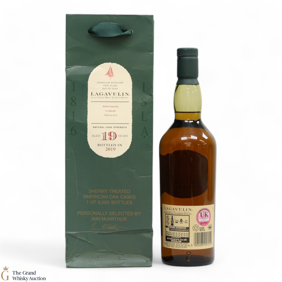The 2019 Fèis Ìle release from Lagavulin was a 19 year old single malt, matured in three types of casks: refill American oak cask, second Sherry treated American oak cask and a European oak puncheon. 6000 bottles were released.