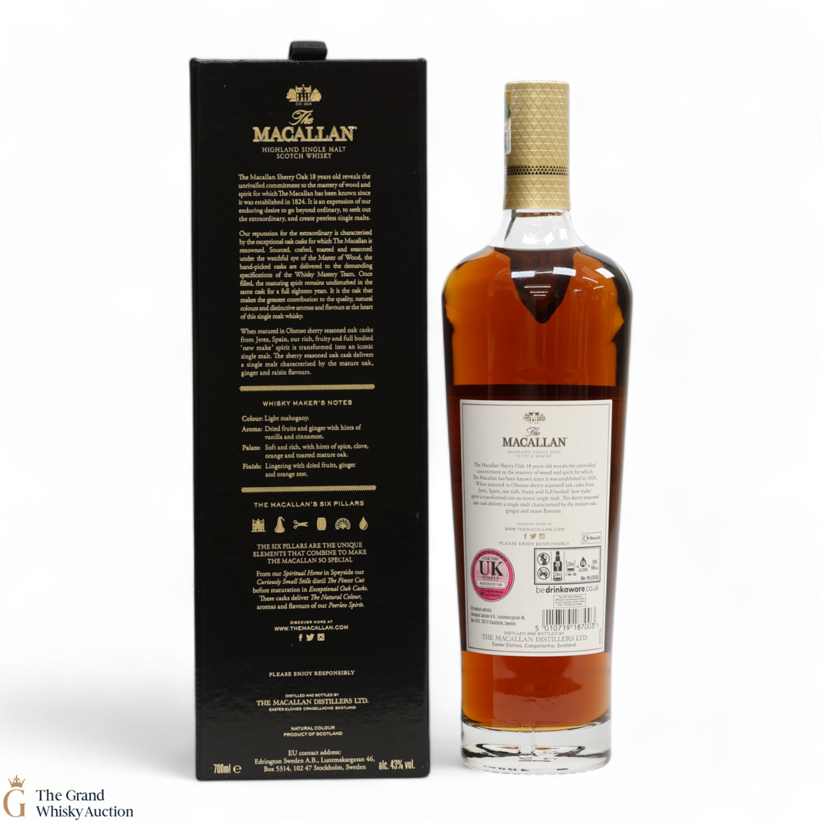 This annual release of The Macallan's popular 18 Year Old Sherry Oak is matured exclusively in sherry seasoned casks, built from both Spanish and American oak, providing a beautifully dark flavour with rich aromas.