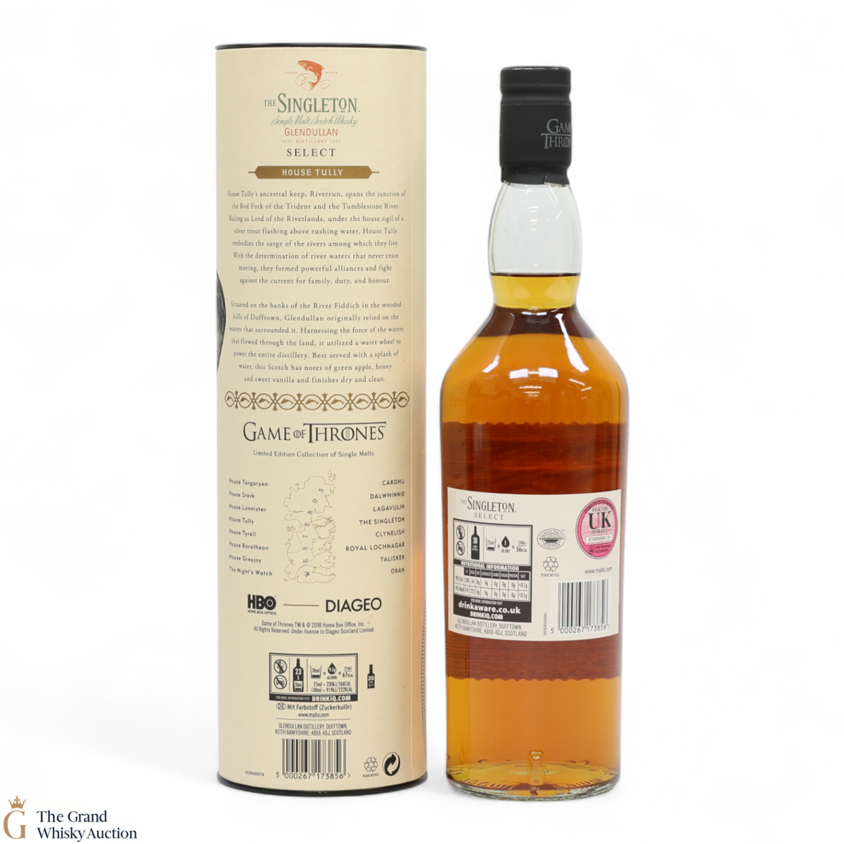 The Singleton Glendullan Reserve hails from Dufftown distillery. Glendullan is located on the banks of the River Fiddich, so it has been cleverly paired with House Tully at Riverrun, which is in the region known as The Riverlands. This single malt Scotch whisky is decorated with a jumping trout - the sigil of House Tully.