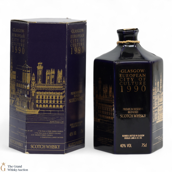 A very collectable decanter by Douglas Laing with illustrations of famous Glasgow landmarks in gold to celebrate Glasgow being bestowed the title of the European City of Culture in 1990.