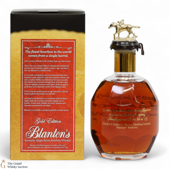 PLEASE NOTE: The wax seal on Blanton's bottles are prone to cracking in transit due to their design. Therefore, as stated in our T&C’s, we do not and will not accept liability should the seal be breached, broken, split or leak in transit. Additionally, please know due to the design of the internal cardboard packaging that surrounds the top of the bottles, it too may be torn. By bidding on this lot you have understood this to be true. Insurance is for complete breakage or loss in transit only.