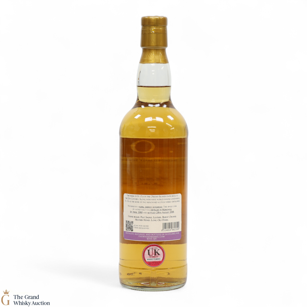 This blended Orcadian malt was matured in a refill sherry hogshead, this single cask of vatted malt was distilled in Kirkwall 1st April 2010 and bottled 28th August 2018 for The Whisky Barrel Ltd.