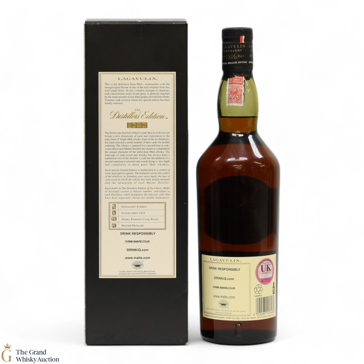 This Lagavulin Distillers Edition was distilled in 1994 before being bottled in 2010. This 16-year-old (ish) single malt whisky of the Classic Malts Selection was matured twice in European Pedro Ximenez Sherry oak casks - these give the whisky more fruity and syrupy character.