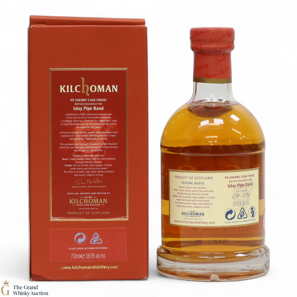 The 2015 Islay Pipe Band single cask was a bourbon barrel filled in 2010 and finished a Pedro Ximenez sherry cask for 2 months prior to bottling. It was a limited release of just 270 individually numbered bottles.