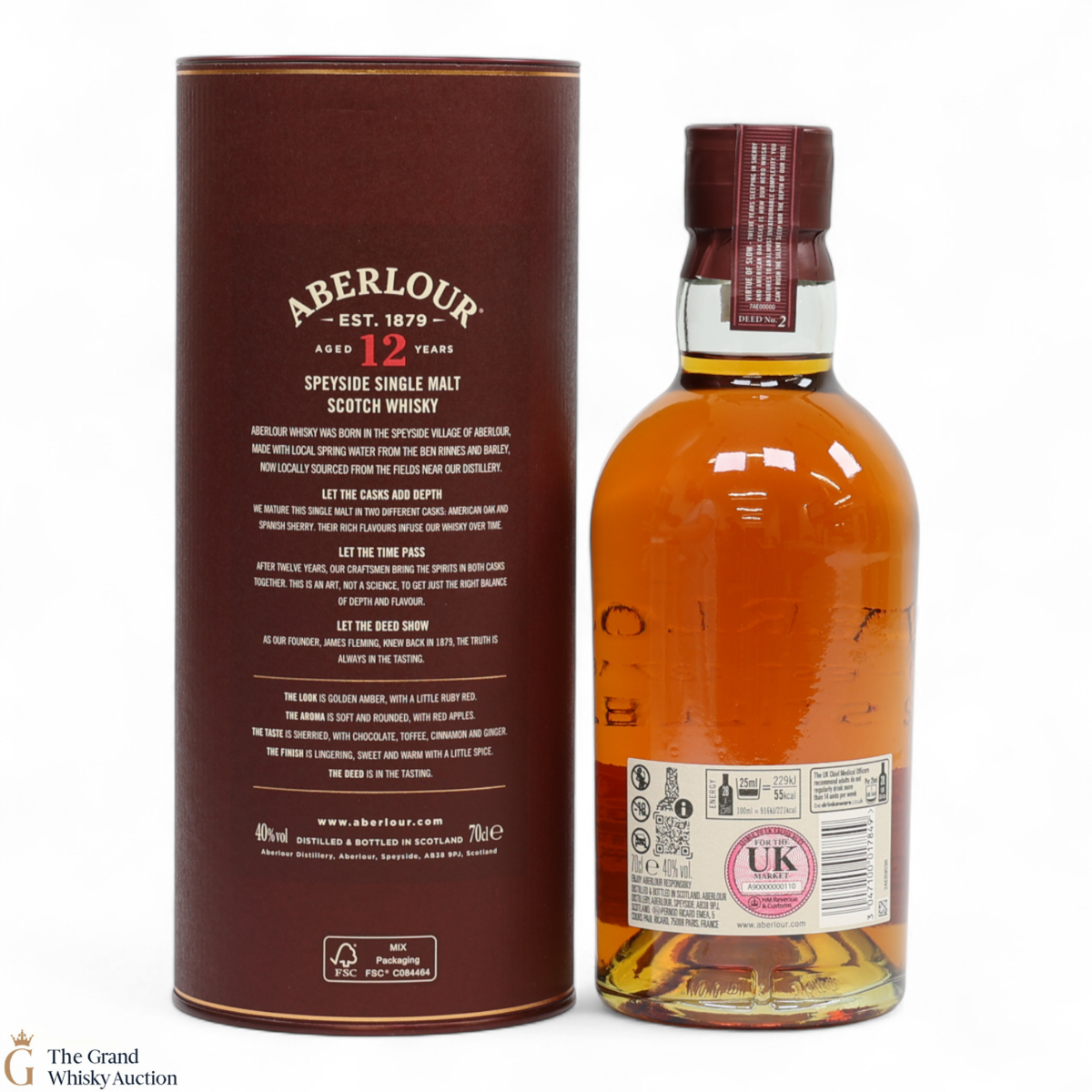 This Aberlour 12 Year Old, has been double cask matured in two handmade oak cask types. The double maturation of both traditional oak and sherry casks adds depth of character to this single malt, now bottled at 40% abv.