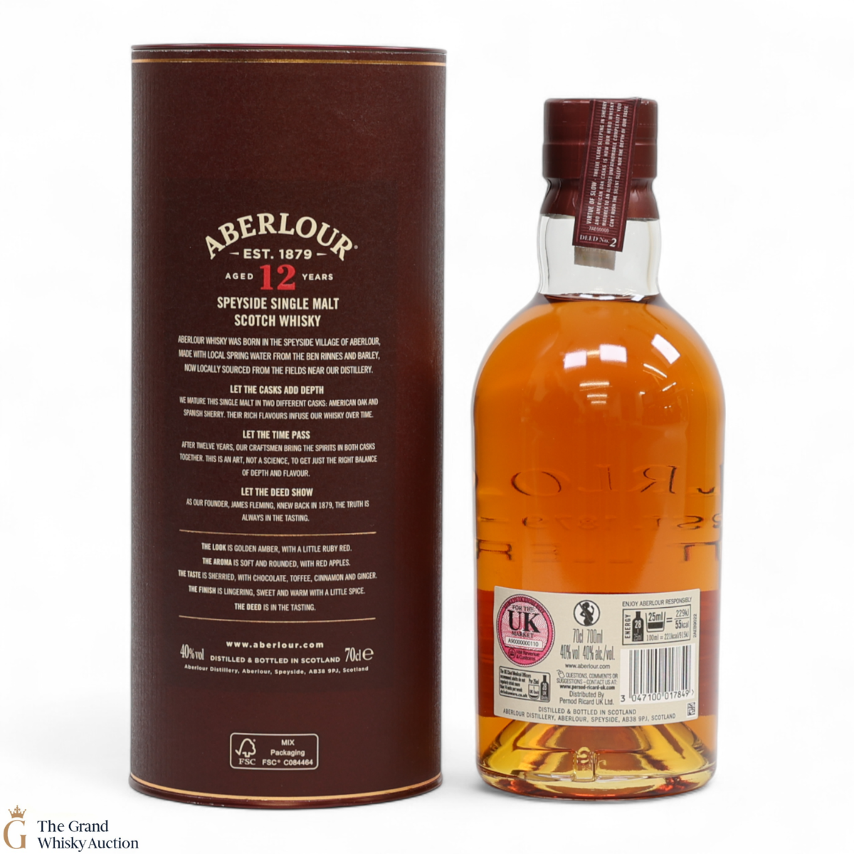 This Aberlour 12 Year Old, has been double cask matured in two handmade oak cask types. The double maturation of both traditional oak and sherry casks adds depth of character to this single malt, now bottled at 40% abv.
