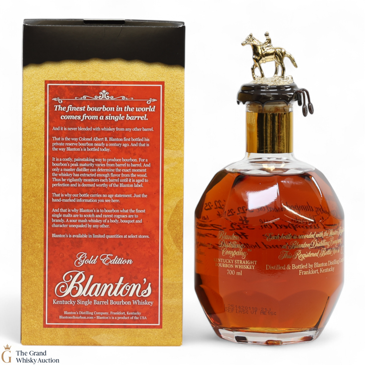PLEASE NOTE: The wax seal on Blanton's bottles are prone to cracking in transit due to their design. Therefore, as stated in our T&C’s, we do not and will not accept liability should the seal be breached, broken, split or leak in transit. Additionally, please know due to the design of the internal cardboard packaging that surrounds the top of the bottles, it too may be torn. By bidding on this lot you have understood this to be true. Insurance is for complete breakage or loss in transit only.