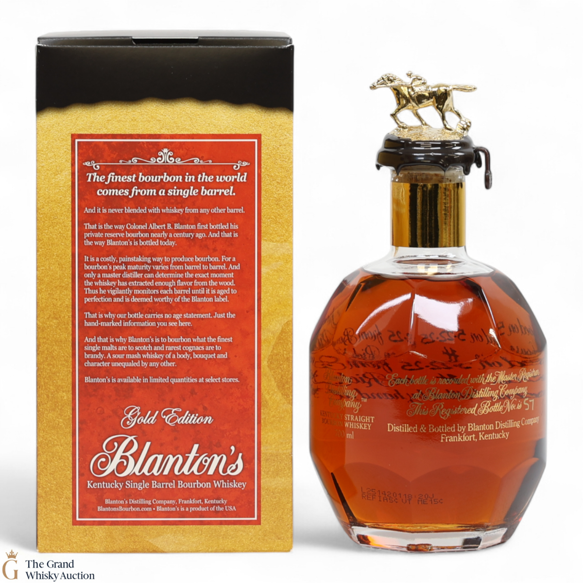 PLEASE NOTE: The wax seal on Blanton's bottles are prone to cracking in transit due to their design. Therefore, as stated in our T&C’s, we do not and will not accept liability should the seal be breached, broken, split or leak in transit. Additionally, please know due to the design of the internal cardboard packaging that surrounds the top of the bottles, it too may be torn. By bidding on this lot you have understood this to be true. Insurance is for complete breakage or loss in transit only.