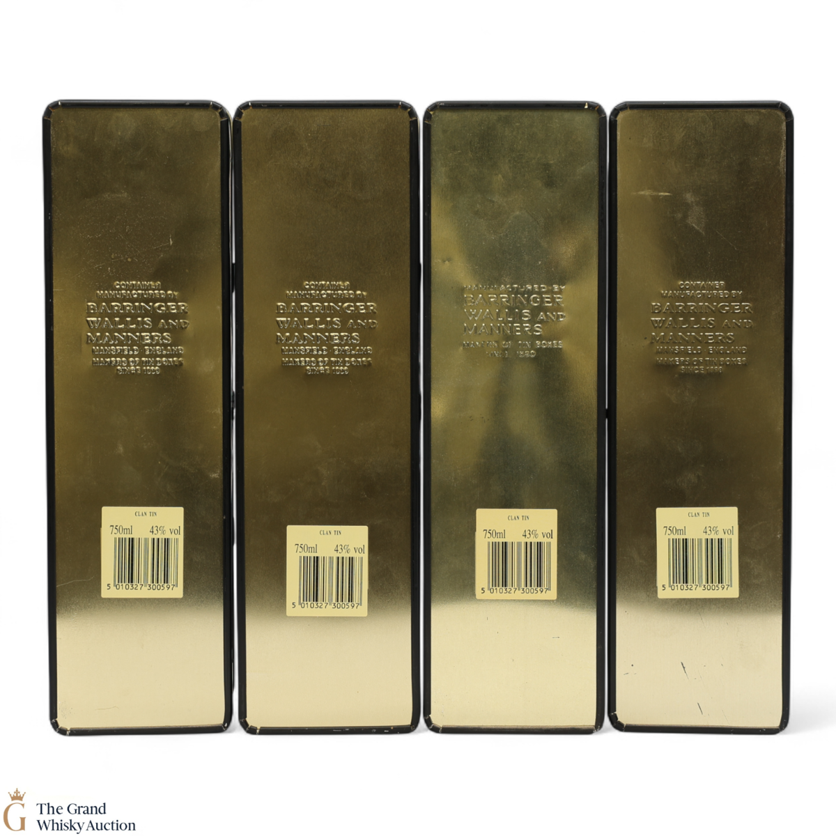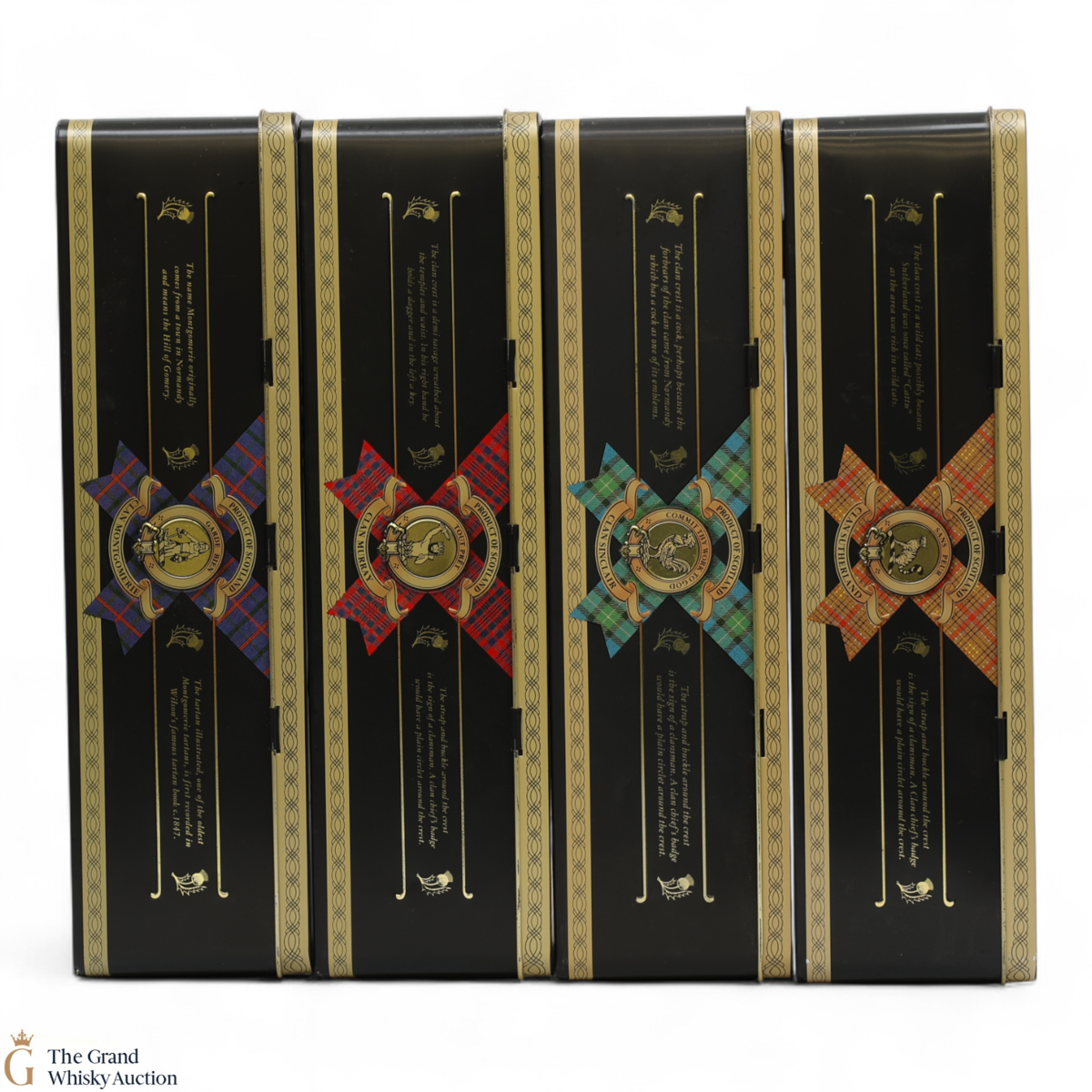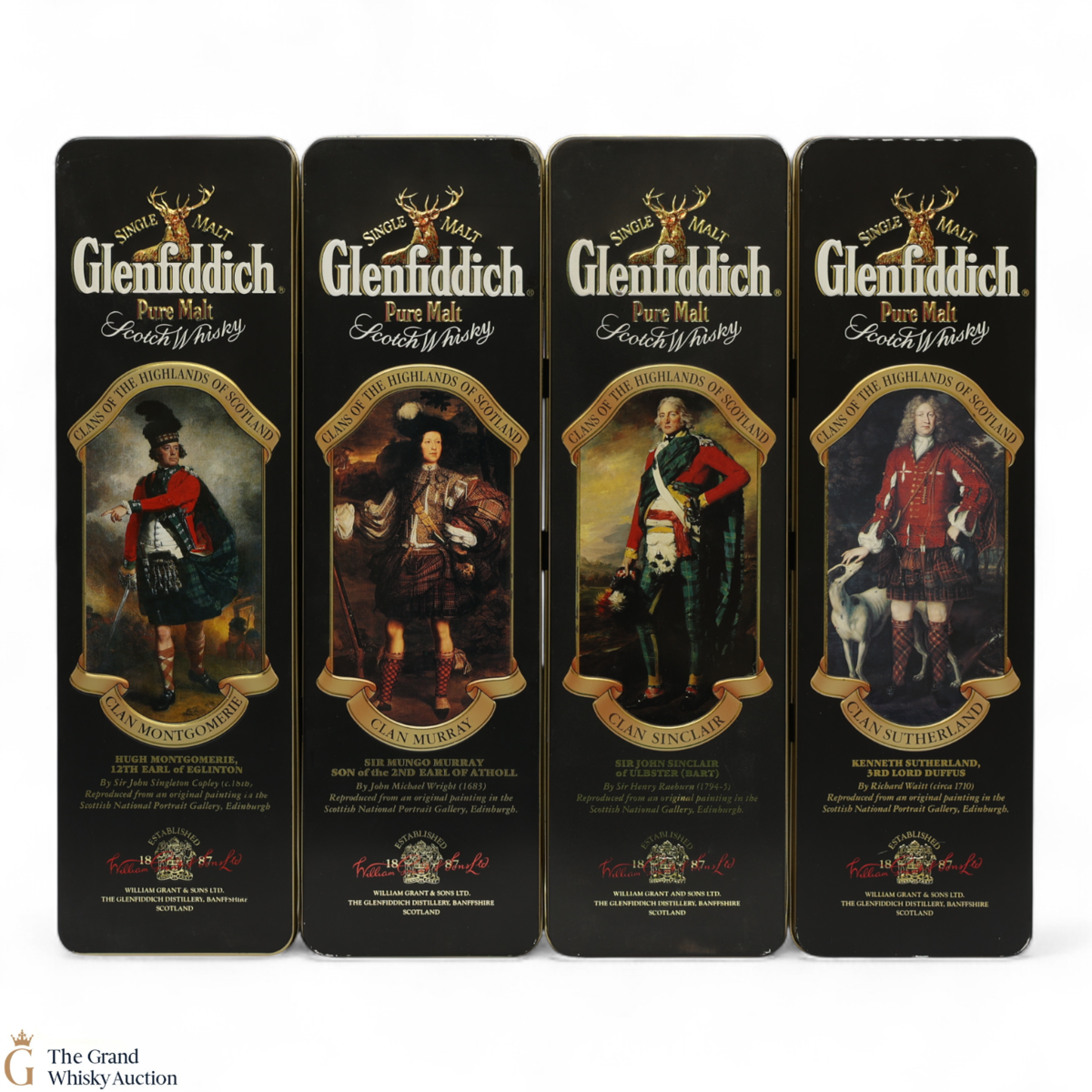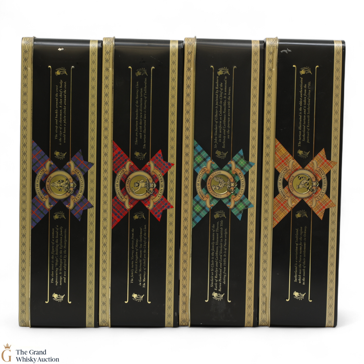 A collectable Glenfiddich set of single malt Scotch whiskies from the 1980s in Clans Of The Scottish Highlands presentation tins.