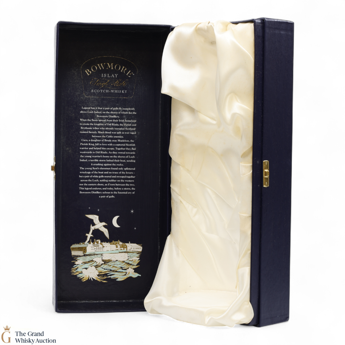 A stunning 25 year old single malt bottling from Bowmore. It comes in a rare blue ceramic bottle featuring two gulls and with a beautiful, lined presentation case to celebrate one of the legends of Bowmore. The Gulls Legend is printed inside the lid of the presentation case:
